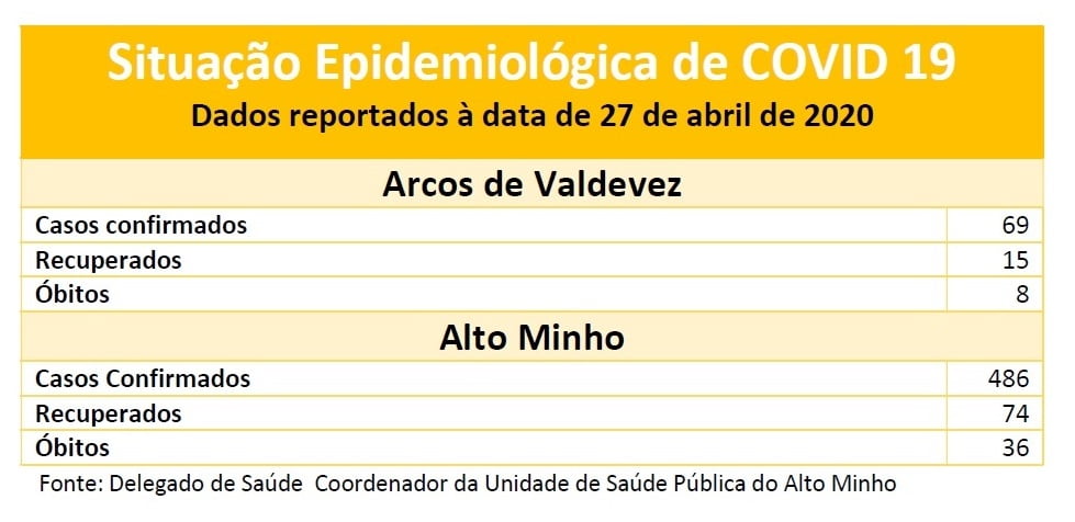 Recorde-se que no concelho de Arcos de Valdevez, por decisão da Unidade de Saúde Pública do Alto Minho, os dados deixaram de ser partilhados com a Comunicação Social desde o dia 21 de Abril, altura em que o concelho apresentava 47 casos ativos, 6 óbitos e 9 recuperados. A partir dessa data os dados oficiais do concelho passaram a ser reportados exclusivamente pelos boletins diários da DGS.