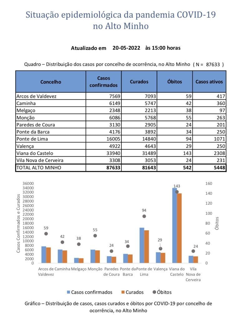 O novo relatório epidemiológico emitido pela ULSAM com dados atualizados até esta sexta-feira indica que o distrito de Viana do Castelo contabiliza um total de 87.633 casos confirmados, 542 óbitos e 81.643 recuperados desde o início da pandemia.
