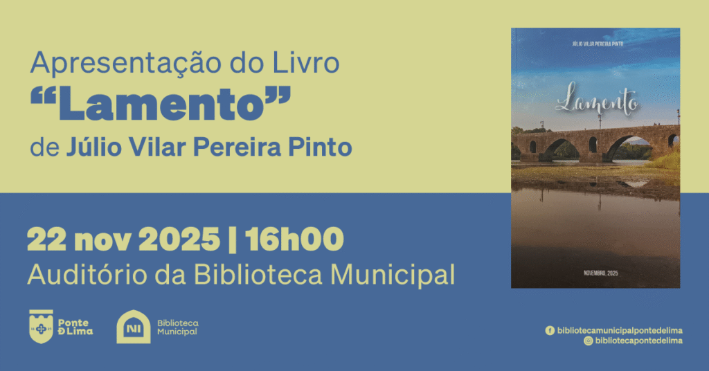 O Município de Ponte de Lima, em parceria com a Associação de Escritores, Jornalistas e Produtores Culturais de Ponte de Lima, promove a apresentação da mais recente obra poética de Júlio Vilar Pereira Pinto, intitulada “Lamento”, que terá lugar no dia 22 de novembro de 2025, às 16h00, no Auditório da Biblioteca Municipal.